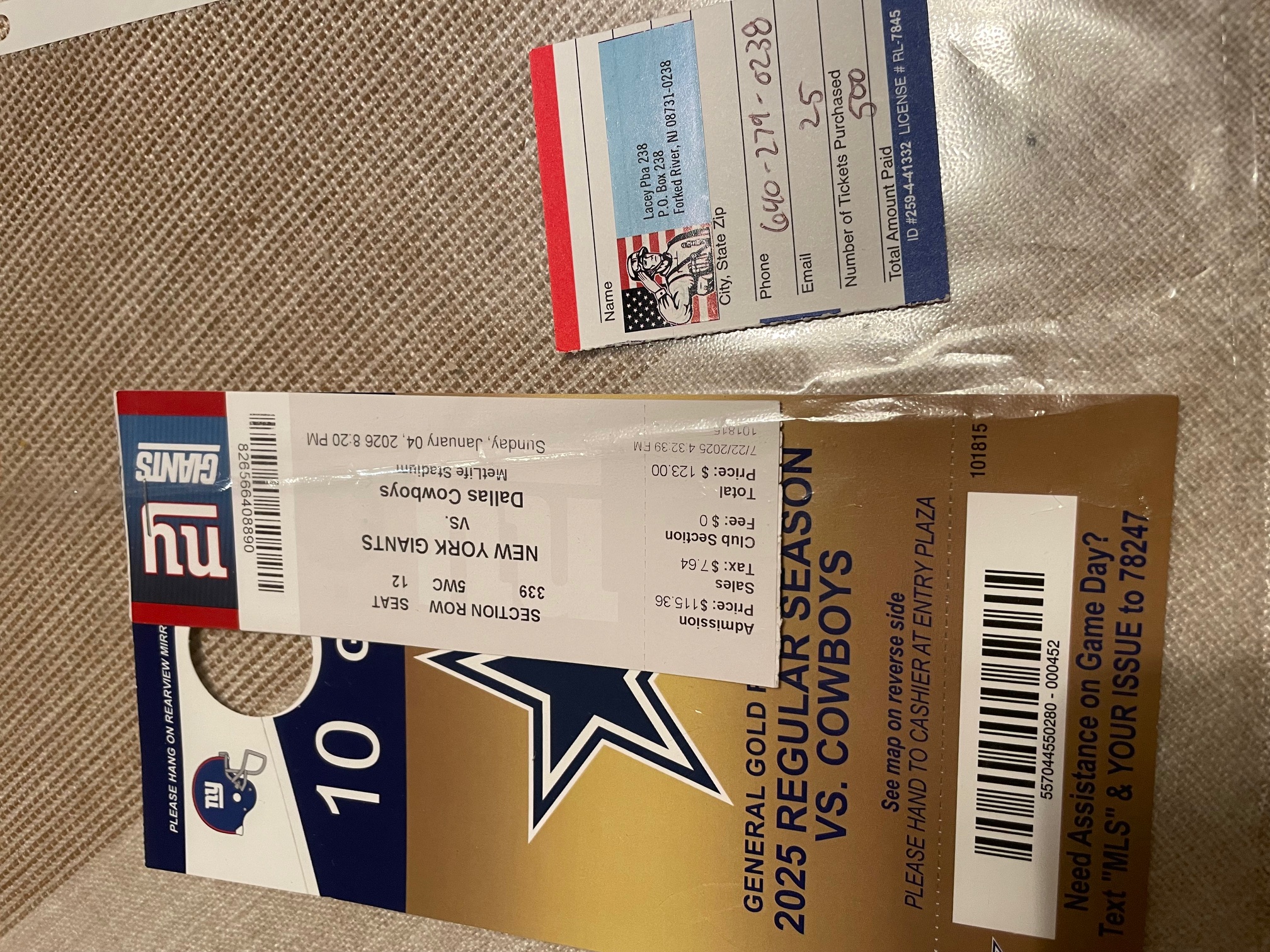 2018 at the River Rock Sports Bar in Brick, NJ for two (2) tickets and parking pass to the Giants vs.